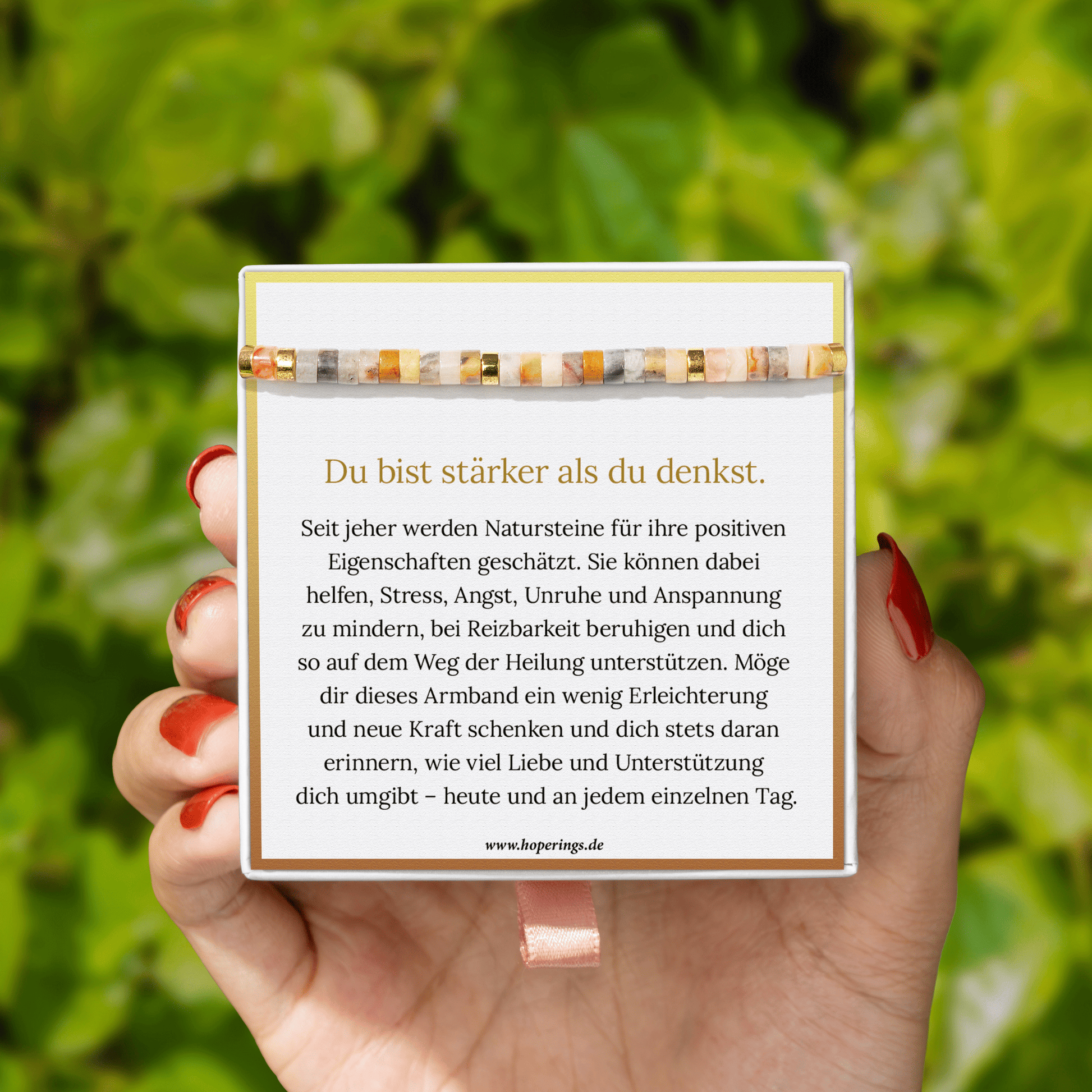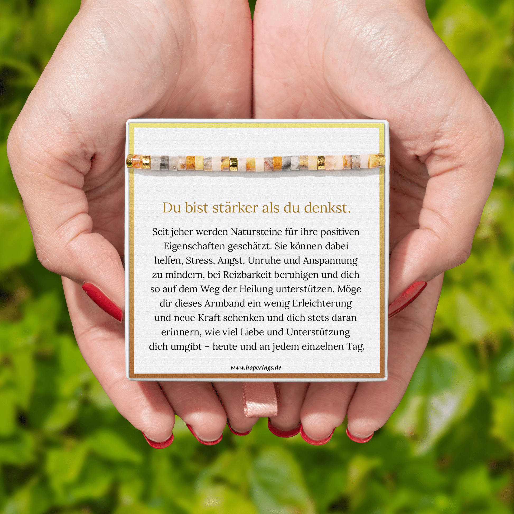 „Ich liebe dieses Armband absolut! Es ist nicht nur wunderschön, sondern auch die Botschaft ist total inspirierend. Ich trage es jeden Tag als Erinnerung daran, stark zu bleiben.“